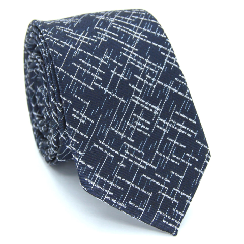 Eleve seu guarda-roupa com a Gravata Slim Estampa Desenhada Azul Meia Noite e Branca e esteja preparado para atrair olhares admirativos onde quer que vá.